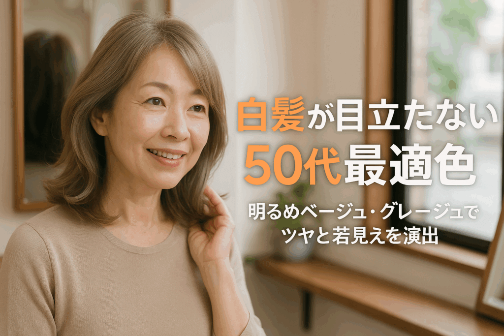 本記事では、50代に似合う明るめベージュ・グレージュ・アッシュグレーを起点に、7〜10トーンで白と黒のコントラストをやわらげる具体策を解説。少ない白髪には細ハイライト、多めならアッシュグレーや白髪ぼかしを提案し、髪型・長さ・男女別の実践テクまで網羅します。